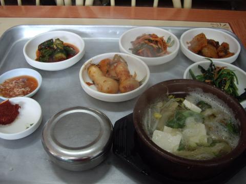 具材はもやし、豆腐。それに干し鱈でしょうか。韓国料理にしてはあっさりした味わいですが、でもキムチはたくさん付いてきます。白菜キムチ、キムチの浅漬け。蕪のキムチと言う調子。