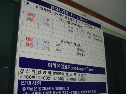 どこのサイトを見ても韓国きってのローカル線なんて紹介のされ方をしている旌善線。起点は堤川ではなく太白線の甑山。昨年訪韓したときに買い求めた時刻表を見ると、1日2往復の通勤列車が甑山とアウラジの間を結んでいる事が分かる。