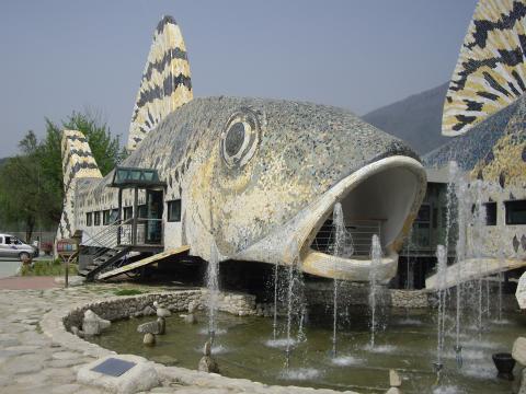 こんな飾り物が。へぇと思って近寄ると改札の人が慌てて、そっちじゃないとゼスチャー。こっちだよねとゼスチャーで返して写真を撮り、さてホームに向かおうとすると、水車の隣に東屋、そこでさっき乗ったムグンファの酒盛り組みが続きをやってた……